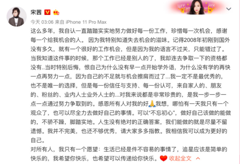 「這麼多年,我自認一直踏踏實實地努力做好每一份工作,珍惜每一次機會,感謝每一個給我機會的人。 因爲我特別知道失去機會的滋味。記得2008年初剛到國外沒有多久,就有一個很好的工作機會,但是因爲我的語言不過關,只能錯過了。當我知道這件事的時候,那個工作已經是別人的了,我卻連去爭取一下的資格都沒有..當時特別後悔,恨自己爲什麼沒有早一點開始學外語,爲什麼沒有學的再快一點再努力一點,因爲自己的不足就與機會擦肩而過了…我一定不是最優秀的,也不是唯一的選擇,但是每一份信任與支持、每一份認可,來自家人的、朋友的、粉絲的、業內人士業外人士的…對我來說都是非常珍貴的,是我一步一步一點一點通過努力爭取到的。感恩所有人對我的好。我想,哪怕有一天我只有一個觀衆了,也可以盡全力去做好自己的事情。可以“不忘初心”,做好自己該做的能做的,不驕不躁,腳踏實地。人生沒有絕對的正確答案,我們能做的就是儘量不留遺憾。我並不完美,也還不夠優秀,請大家多多指教。我相信我可以成爲更好的自己。