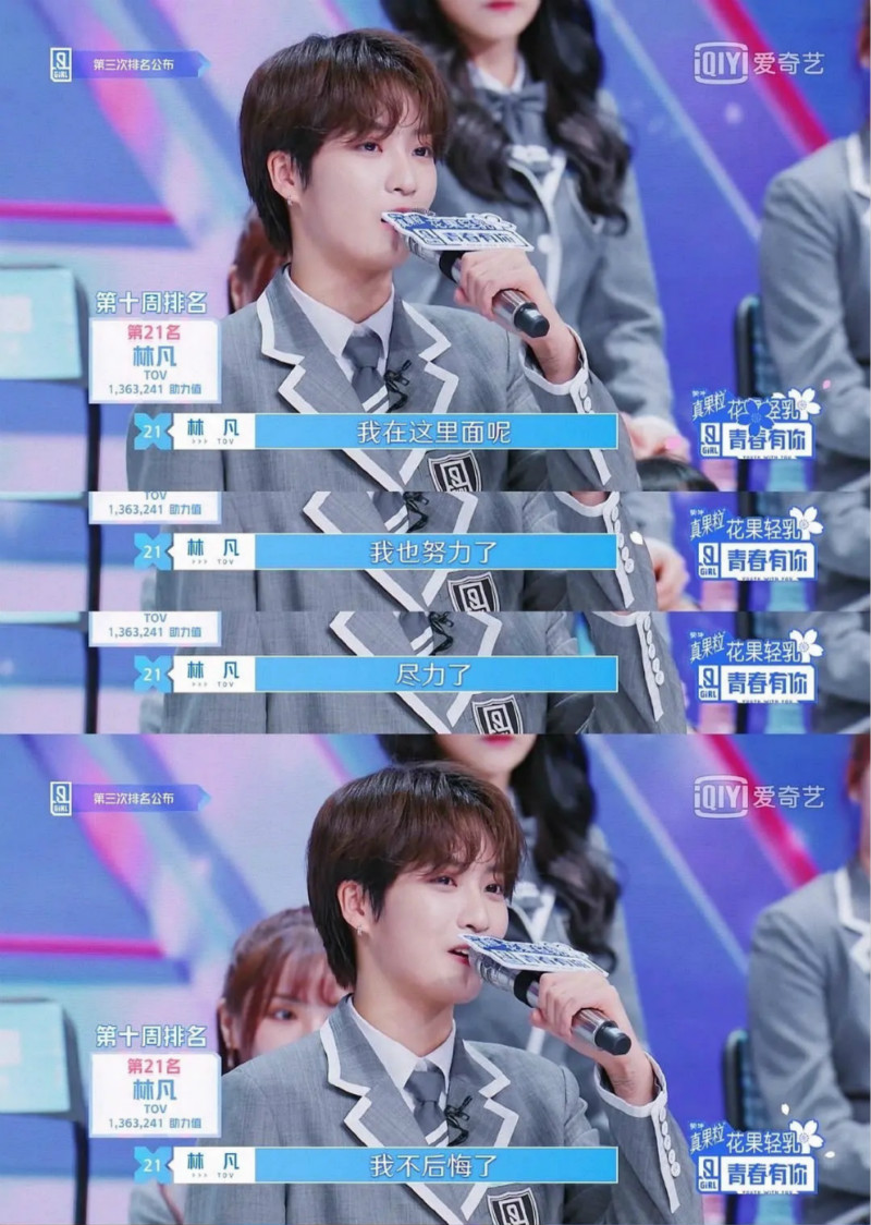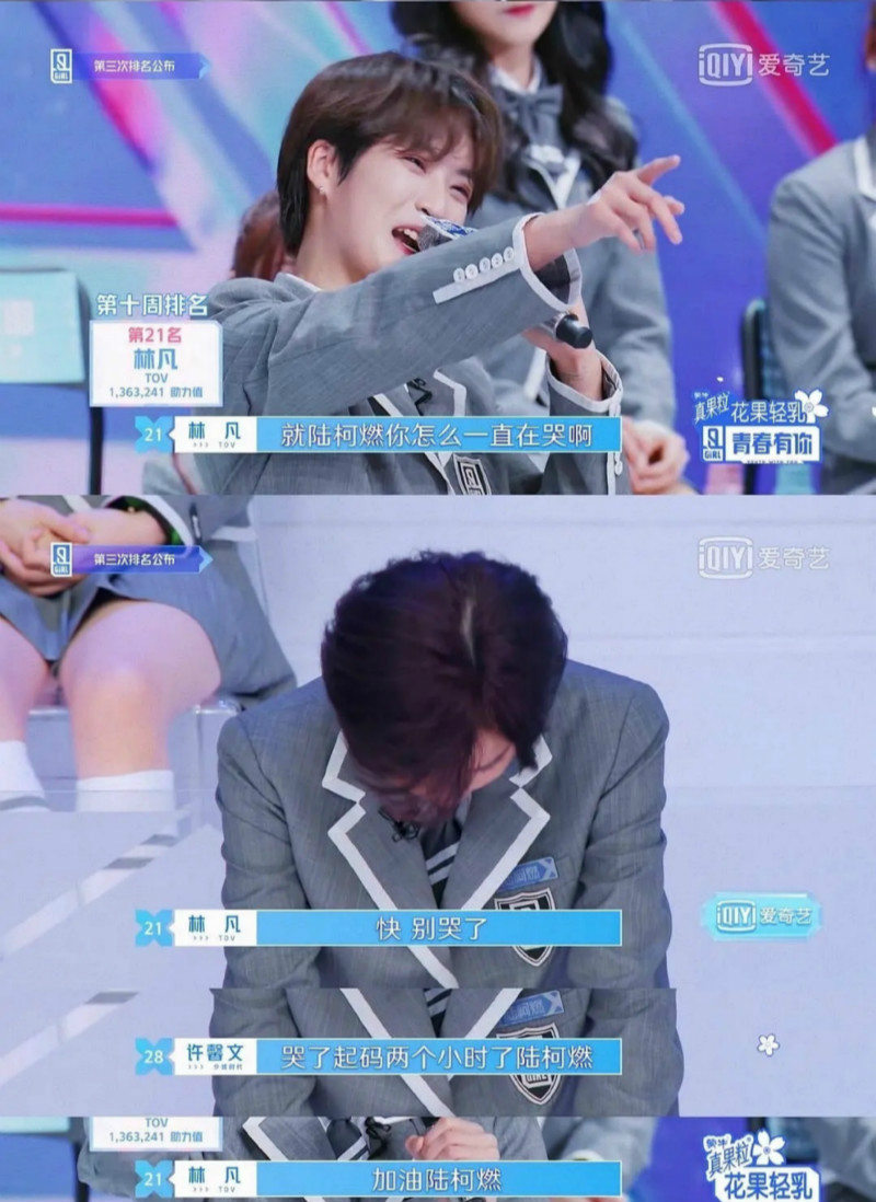暖心的坤製作人也特別要求了製作組,讓淘汰的訓練生也有機會發言。林凡就表示:「我在這裡面呢,我也努力了,盡力了,我不後悔了。就是咱們沒有什麼好傷不傷心的,就陸柯燃你怎麼一直在哭啊!快,別哭了,加油陸柯燃!」