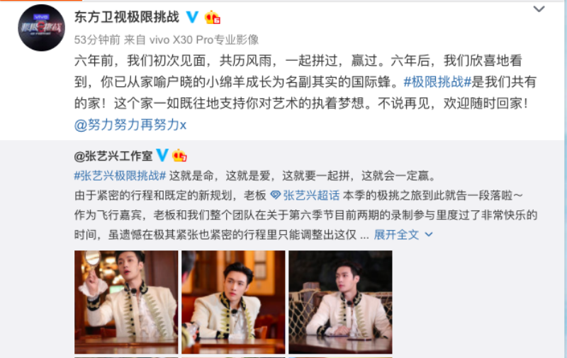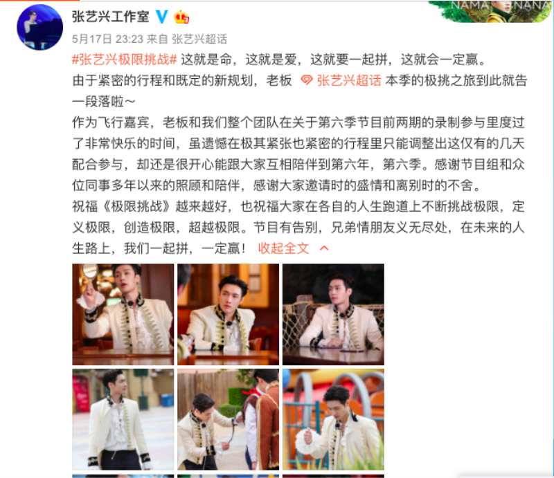 「這就是命,這就是愛,這就要一起拼,這就會一定贏。由於緊密的行程和既定的新規劃,老闆張藝興本季的極挑之旅到此就告一段落啦~作爲飛行嘉賓,老闆和我們整個團隊在關於第六季節目前兩期的錄製參與裏,度過了非常快樂的時間,雖遺憾在極其緊張也緊密的行程裏,只能調整出這僅有的幾天配合參與,卻還是很開心能跟大家互相陪伴到第六年,第六季。感謝節目組和衆位同事多年以來的照顧和陪伴,感謝大家邀請時的盛情和離別時的不捨。