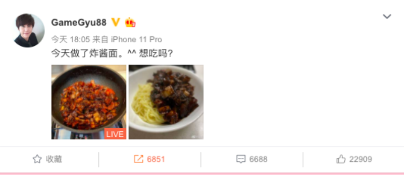 Super Junior忙內圭賢18號傍晚更新了微博,表示:「今天做了炸醬麵。^^想吃嗎?」並搭配了一小段烹飪視頻和炸醬麵完成品。