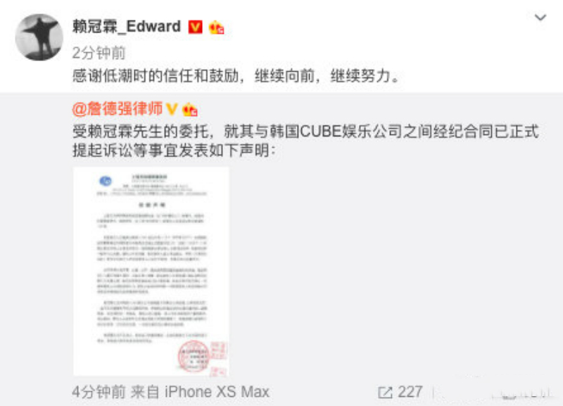 最新,2020年在5月19日晚上,賴冠霖更新微博,表示已經委托律師發表聲明。