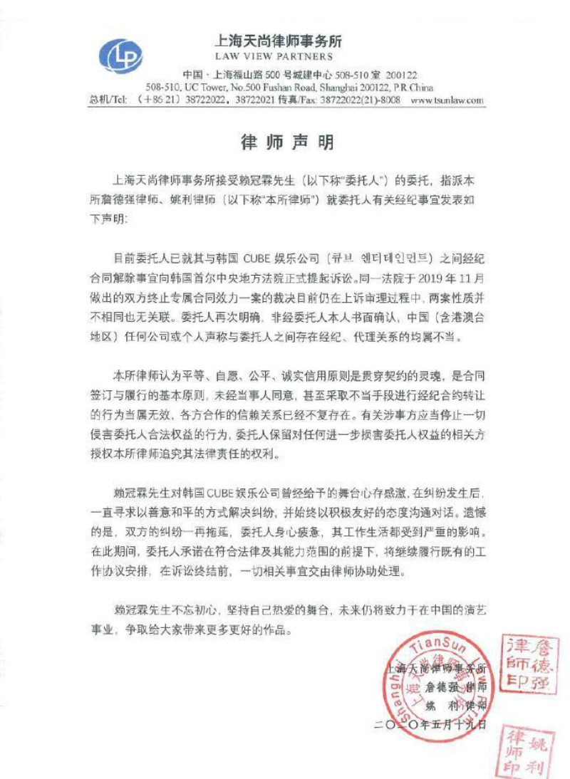 聲明中表示賴冠霖目前已就與韓國CUBE娛樂公司之間經紀合同解除事宜,向韓國首爾中央地方法院正式提起訴訟,在訴訟終結前,一切交由律師協助處理。