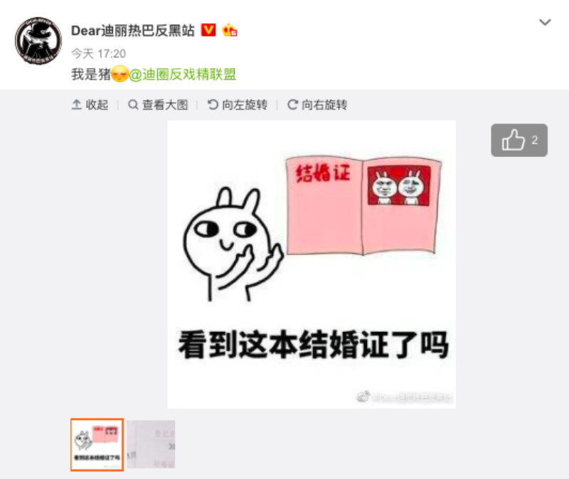 520果然是好日子啊!!!迪麗熱巴的兩個反黑站站長選擇在今天註冊結婚,並分別在各自的站子裡「官宣」。