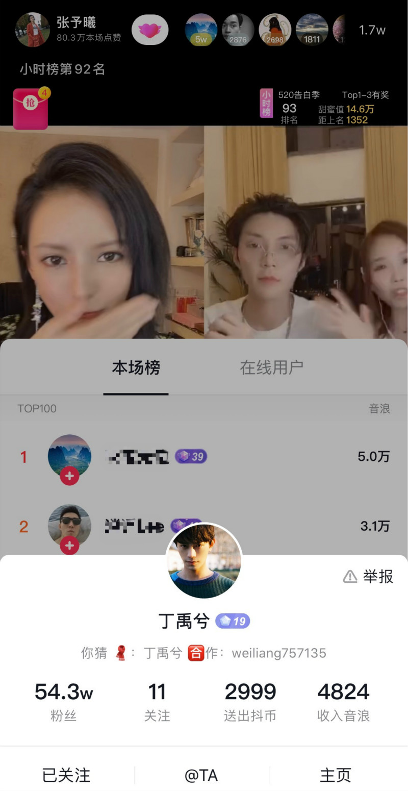 粉絲也說丁禹兮在直播中還送了禮物”2999“給張予曦呢!