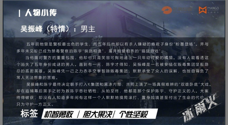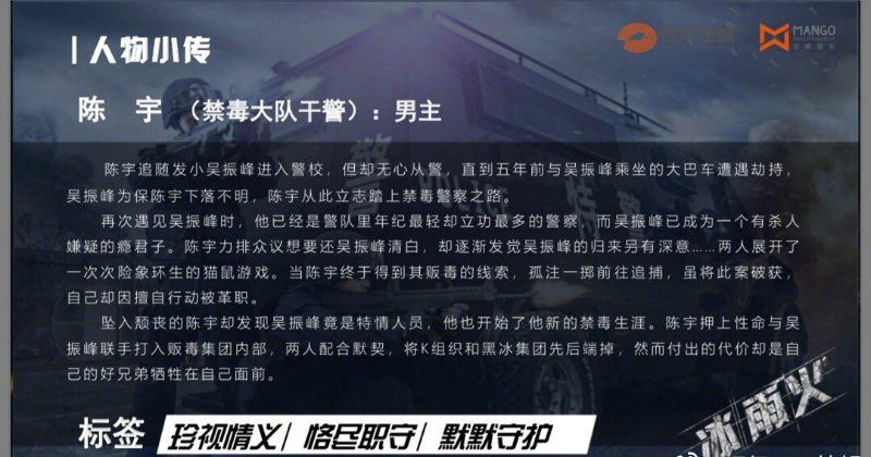 這部劇是雙男主,也就是網傳的王一博、陳曉,來看看兩人飾演的角色!根據招商資料,王一博飾演的是陳宇,是個珍視情義、格盡職守,默默守護的類型。他從小追隨髮小吳振峰進入警校,但卻無心從警,直到五年前與吳振峰乘坐的大巴車遭遇劫持,吳振峰為保護陳宇下落不明,陳宇從此立志踏上禁毒警察之路。再次遇見吳振峰時,他已經是警隊裡年級最輕卻立功最多的警察,而吳振峰已成為一個有殺人嫌疑的癮君子。後來陳宇發現吳振峰竟然是特務人員,他和吳振峰聯手打入販毒集團內部,兩人默契配合將集團消滅,但付出的代價卻是自己的好兄弟犧牲在自己面前。