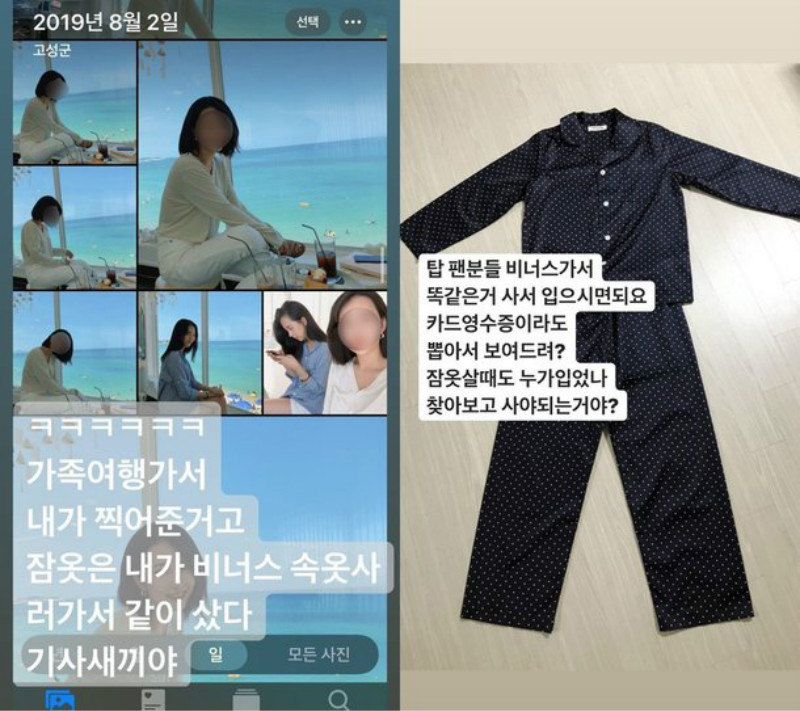 原以為這件事情就這麼平靜下來的時候,沒想到21號,金佳彬的姐姐自己出來反駁了!她在自己的社交網站上曬出了幾張照片,並配上文字說:「這是和家人旅行時給我拍的照片,睡衣是我去買內衣時一起買的。」並且補充道:「T.O.P粉絲們去買一樣的穿就可以了。需要我給你們找購物單收據嗎?買睡衣難道還要找誰穿過嗎?」,並直接強調了兩人絕對不是戀人關係。