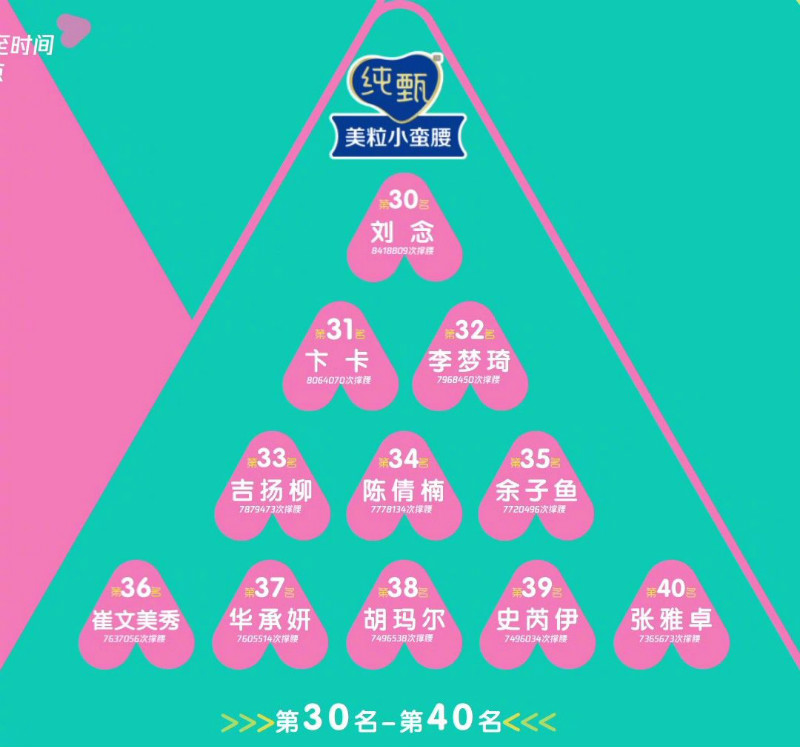 第30~40名:劉念、卞卡、 李夢琦、吉揚柳、陳倩楠、余子魚、崔文美秀、華承妍、胡瑪爾、史芮伊,張雅卓