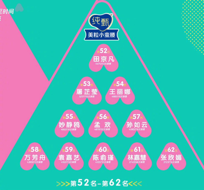 第19-29名:孫珍妮、謝安然、張馨文、胡嘉欣、曾雪瑤、于揚子、許潇晗、王柯、王一橋、康汐、伍雅露