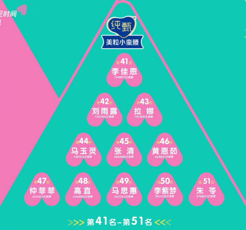 第41-51名:李佳恩、劉雨露、拉娜、馬玉靈、張清、黃恩茹、仲菲菲、高直、馬思慧、李紫夢、朱苓