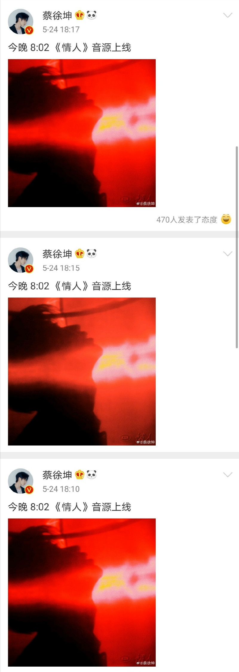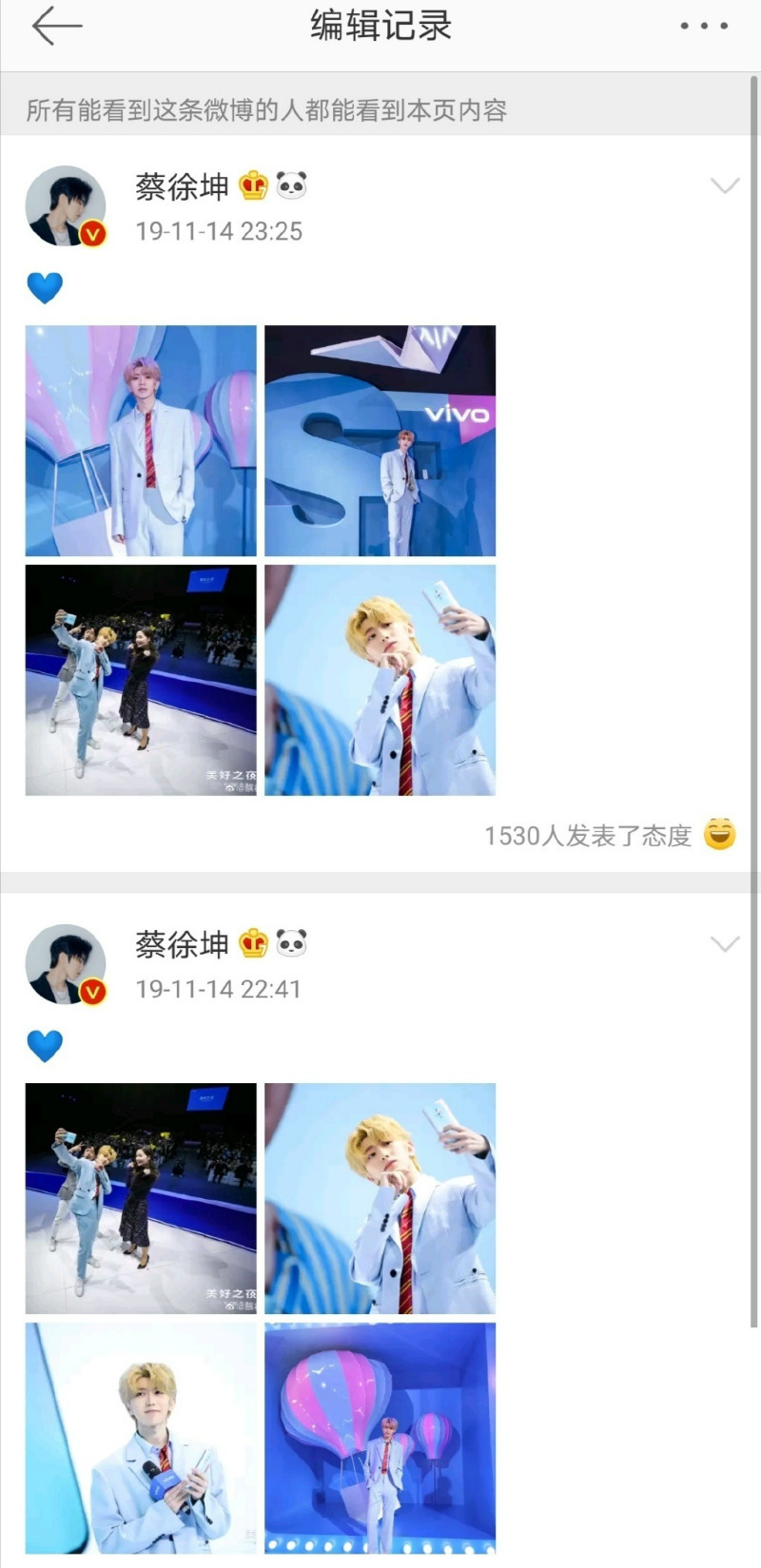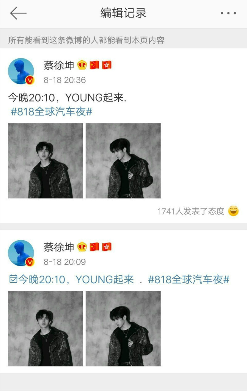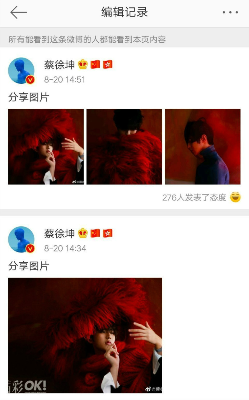 其實這已經不是蔡徐坤第一次在發了微博後,多次進行編輯,有的時候是追最求照片的發佈順序。