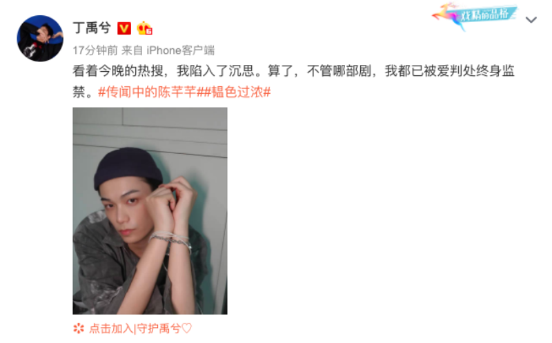 最新!丁禹兮2部劇同時上熱搜!他第一線超有梗回應! 丁禹兮2部劇同時上熱搜! 戲劇星聞 By 歐巴是我的 Last updated May 25, 2020 Share 自己打自己是什麼感覺?25號晚上,由丁禹兮主演的《傳聞中的陳芊芊》和《韞色過濃》同時都上了熱搜!! 《傳聞中的陳芊芊》因為劇情開虐而上熱搜,而《韞色過濃》則因為迎來甜蜜大結局也上了熱搜。 沒想到身為男主的丁禹兮原來也是5G衝浪達人,立刻發博表示:「看著今晚的熱搜,我陷入了沈思。算了,不管哪部劇,我都已被愛判處終身監禁。#傳聞中的陳芊芊##韫色過濃# 」 配圖是很有梗的他用耳機繩捆綁住自己的雙手,搭配無辜的表情,真的是為愛判處終身監禁沒錯了!兩部劇都這麼有話題性,真的要恭喜丁禹兮啊! 丁禹兮傳聞中的陳芊芊韞色過濃 Share