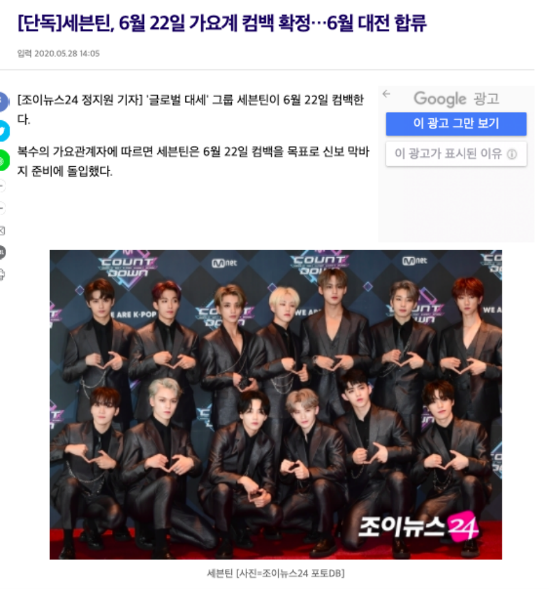 SEVENTEEN 6.22回歸!!合流6月韓團大戰! SEVENTEEN 6.22回歸!!合流6月韓團大戰! 星聞音樂 By 歐巴是我的 On May 28, 2020 Share 嗚哇!6月的韓國一樣很熱鬧啊!除了很多女團回歸,現在韓媒報導SEVENTEEN也將于6月22日回歸…合流6月大戰! 據歌謠界相關人員透露,SEVENTEEN正在以6月22日回歸為目標,進行專輯准備的最後階段中。這是繼去年9月發行的正規3輯《An Ode》之後,時隔約9個月的回歸! 期待嗎?先來一輪高音尖叫吧!!! 圖來源:Joynews24 SEVENTEEN Share