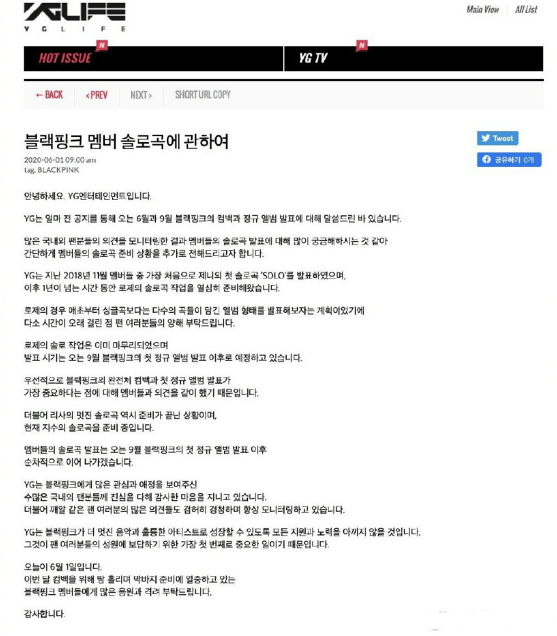 ROSÉ從一開始就準備發售收錄若幹首歌曲的SOLO專輯。 因此,其花費的時間有所延長。 對此,期望大家能諒解。