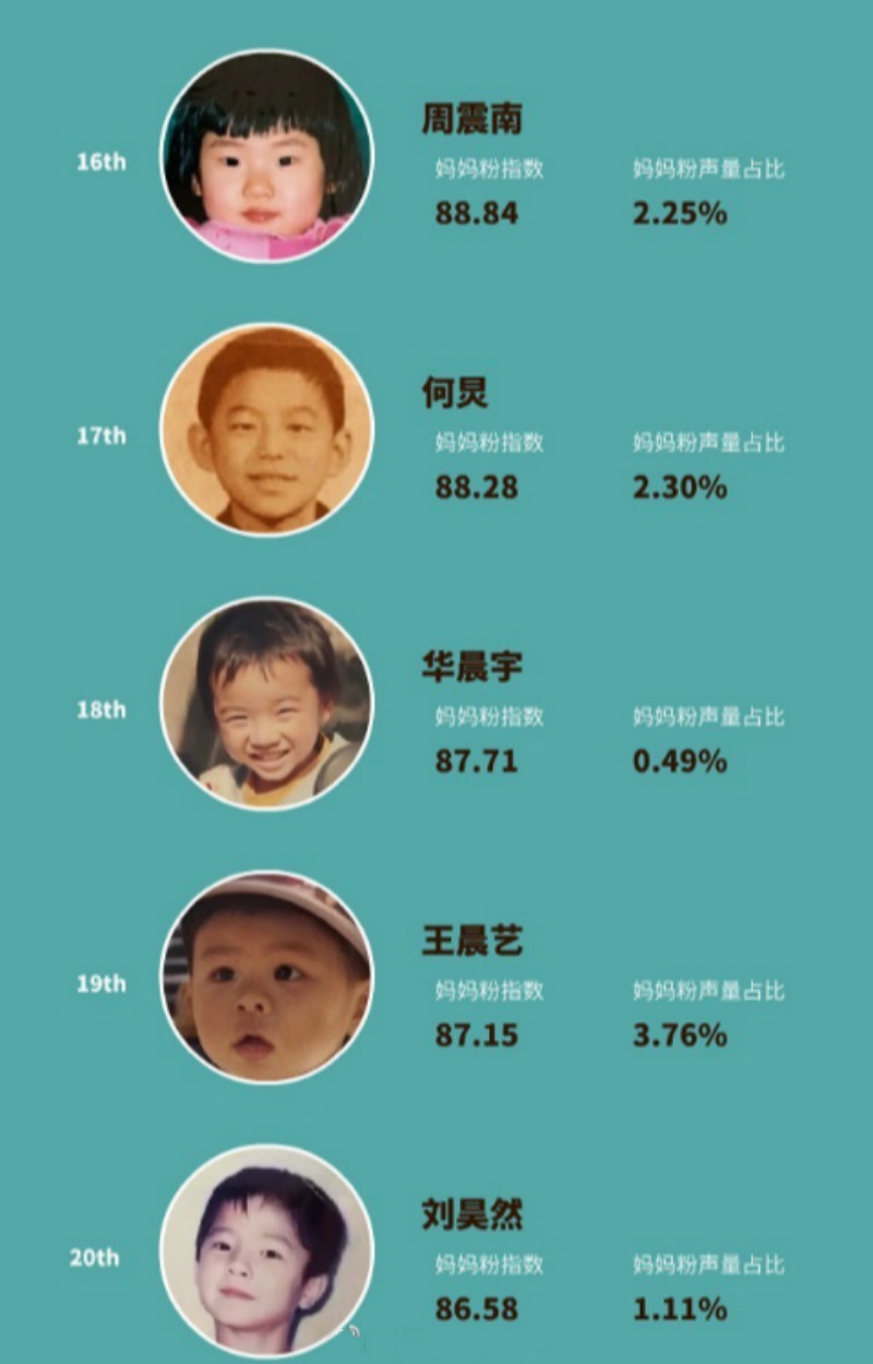 來來來!來圍觀《媽媽粉(or爸爸粉)最疼愛的鵝子榜》Top 20名單!這個名單裡的媽媽粉指數,是根據2018年6月1日至2020年5月31日,長達2年時間內,全網以兒子、崽、鵝子等稱呼愛稱自家愛豆,或以媽媽、麻麻等(或爸爸)身份自稱的粉絲所產生的聲量綜合計算得出。而聲量佔比的部分,則代表媽媽粉佔了該藝人整體聲量的多少巴仙(100%)。就來看看,到底誰是最多媽媽疼愛的鵝子吧!顆顆顆!