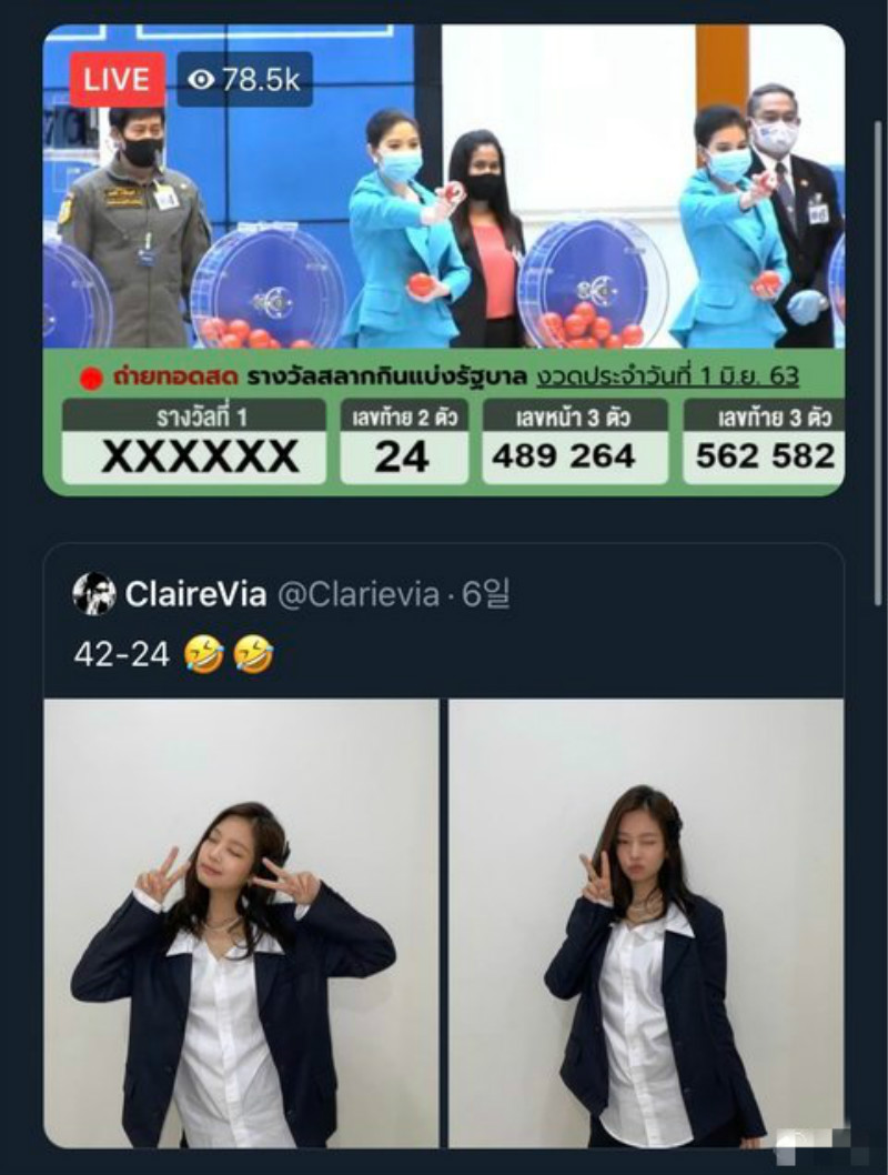 BLACKPINK的JENNIE真的是幸運女神啊啊啊啊!原來在泰國粉絲中有這樣的一個傳說:「幸運的彩票女神JENNIE」,意思就是只要跟著JENNIE的姿勢買彩票的話,就一定會中獎!!
