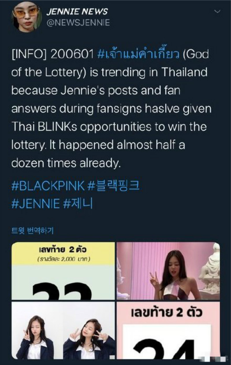 結果「God of the Lottery」在泰國推特就上了熱搜!因為JENNIE的社交網站貼文,或者在簽名會上給粉絲寫的數字,都讓BLINKs贏取了彩票!