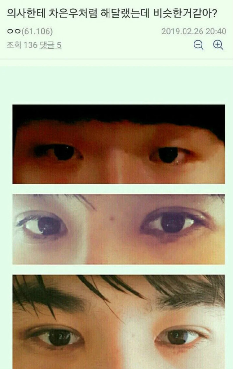 來來來!!!一起來圍觀一下!有韓國網友發帖問:「和醫生說想整容成車銀優那樣,大家覺得有像嗎?」並貼出了3雙眼睛對比,相信是整容前後。