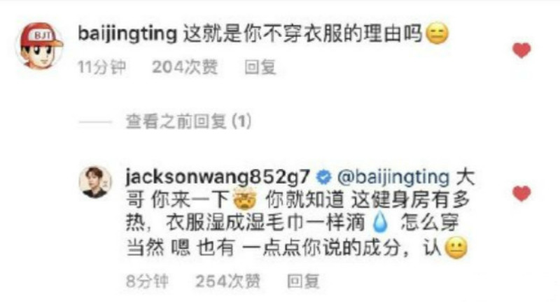 結果白敬亭就留言:「這就是你不穿衣服的理由嗎?」也讓王嘉爾回復:「大哥,你來一下,你就知道,這健身房有多熱,衣服濕成濕毛巾一樣滴水,怎麼穿。當然 嗯 也有一點點你說的承認,認」
