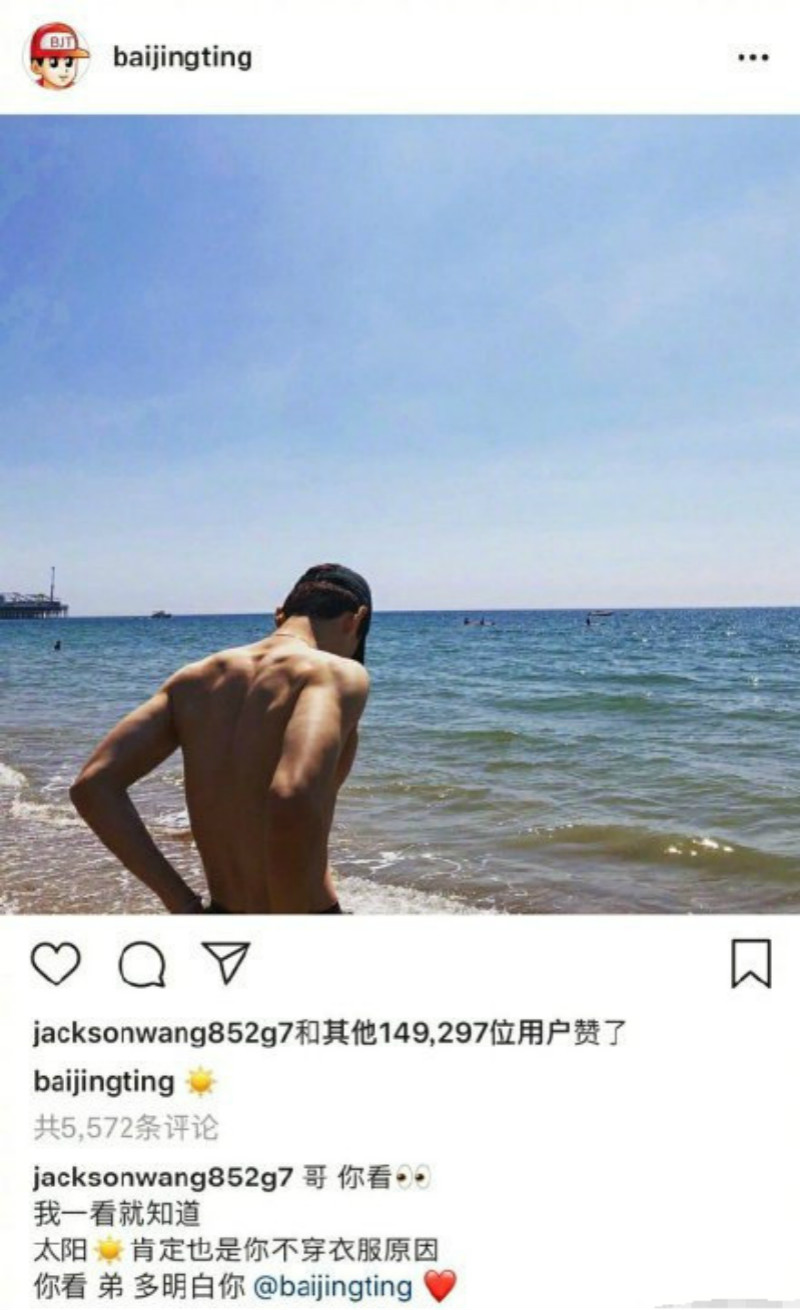 結果過後當白敬亭分享了自己在海邊裸上身的照片時,王嘎嘎就來了,「哥,你看,我一看就知道,太陽 肯定也是你不穿衣服的原因,你看 弟 多明白你」