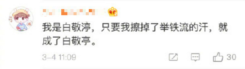 「我是白敬渟,只要我擦掉了舉鐵流的汗,就成了白敬亭」。