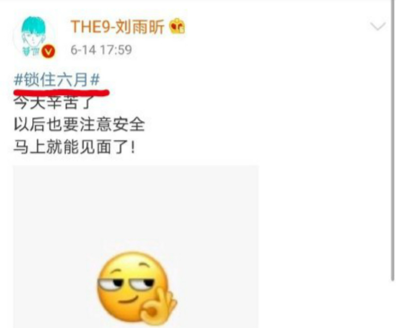 THE9劉雨昕也在微博發文了,發了個「OK」手勢可愛圖案的她就寫道,「#鎖住六月# 今天辛苦了,以後也要注意安全,馬上就能見面了!」