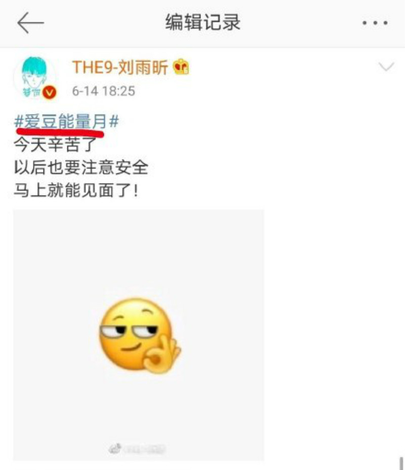 知道自己帶錯話題後,乖寶寶劉雨昕就立馬更改成了:「#愛豆能量月 # 今天辛苦了,以後也要注意安全,馬上就能見面了!」