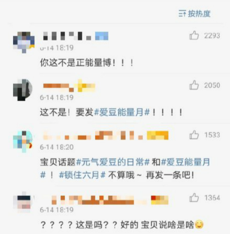 結果這個貼文馬上就被粉絲們留言「溫馨提醒」:「你這不是正能量播!」、「這不是!要發 #愛豆能量月#!!!」,還有人說,「寶貝話題 #元氣愛豆的日常# 和 #愛豆能量月! #鎖住六月# 不算哦~再發一條吧!