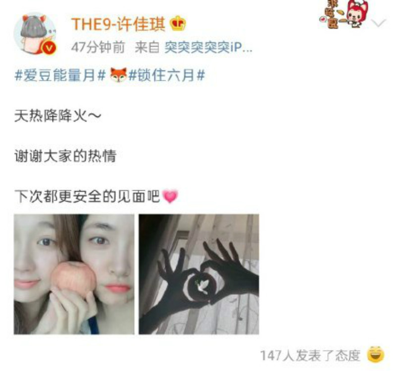 配合#愛豆能量月 的標籤,好多愛豆都在發博時帶上了這個標籤,其中THE9的虞書欣和KIKI許佳琪為了平息粉絲們之間的罵戰,也特地同時上傳了一樣的照片和貼文。點我看:THE9虞書欣、KIKI許佳琪親自營業讓粉絲降火! 蘋果、和平鴿都用上了!
