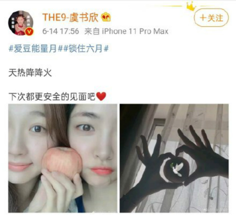配合#愛豆能量月 的標籤,好多愛豆都在發博時帶上了這個標籤,其中THE9的虞書欣和KIKI許佳琪為了平息粉絲們之間的罵戰,也特地同時上傳了一樣的照片和貼文。點我看:THE9虞書欣、KIKI許佳琪親自營業讓粉絲降火! 蘋果、和平鴿都用上了!