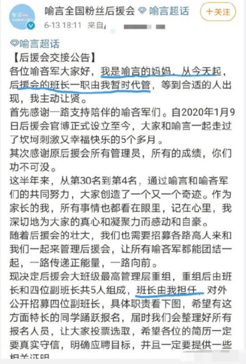 什麼?為什麼才接管兩天,THE9喻言的媽媽就宣佈退出後援會了呢?事情一開始是在6月13日,喻言全國粉絲後援會就發出了「後援會交接公告」,通告文中一開始就表示後援會的「班長」一職暫由喻言的媽媽代管:「各位喻吝軍大家好,我是喻言的媽媽,從今天起,後援會的一職由我暫時代管,等到合適的人出現,我主動讓賢」。