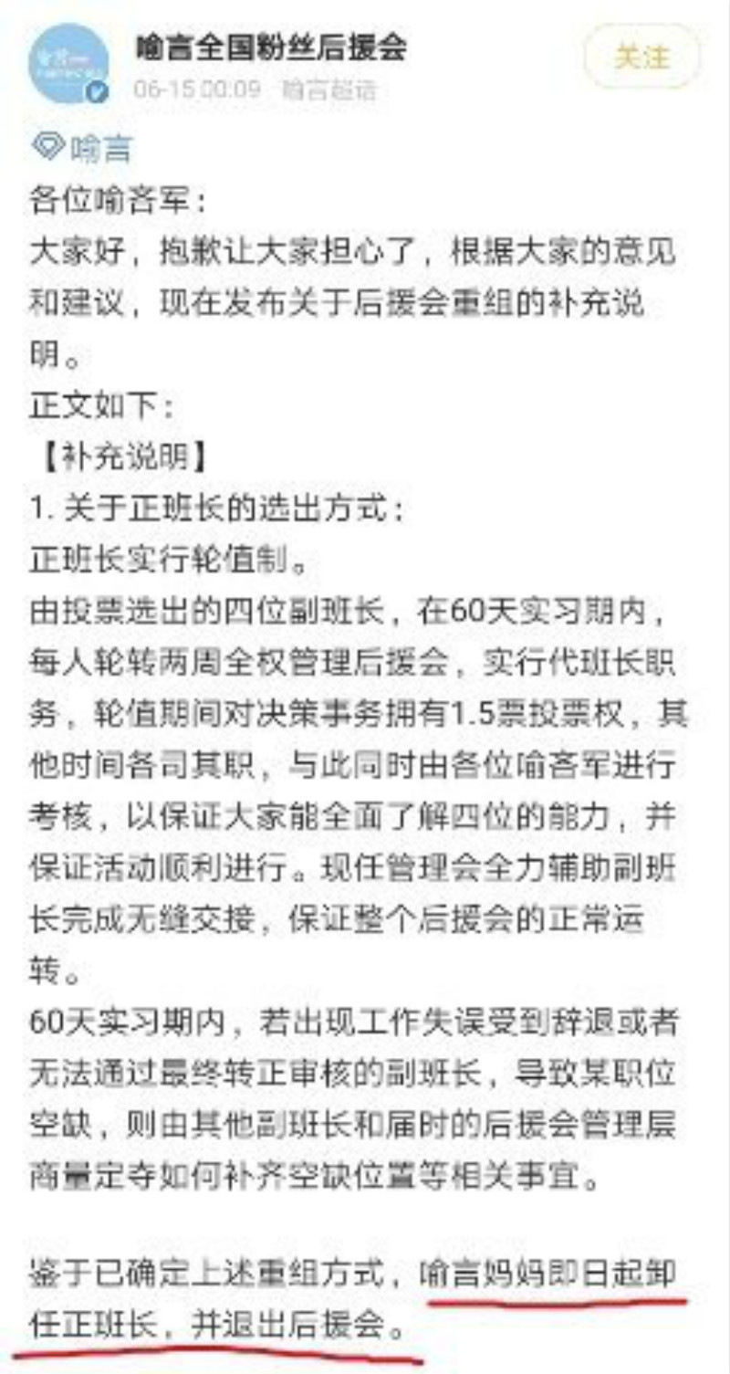 沒想到在兩天後的凌晨,喻言全國粉絲後援會就發出公告,表示「喻言媽媽即日起卸任正班長,並退出後援會」。另外,通告中也提到了後援會重組以及選出「正班長」的方式。