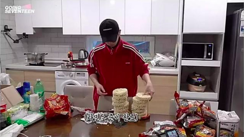 但其實小17一直都以「人數多、很會吃」橫走韓國娛樂圈,顆顆顆!像是成員裡的珉奎強項之一,就是非常會煮20人份的泡麵,你可以想象在SVT宿舍煮泡麵的畫面了嗎?重點是,在《Going SEVENTEEN》中,只是9個人就要吃掉15包泡麵!!!!社長nim的眼淚啊!