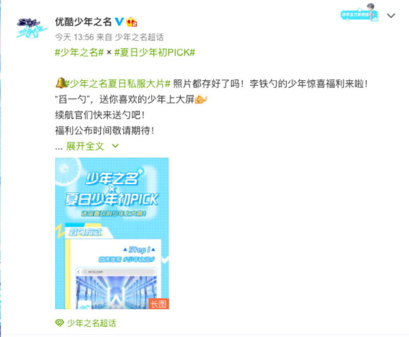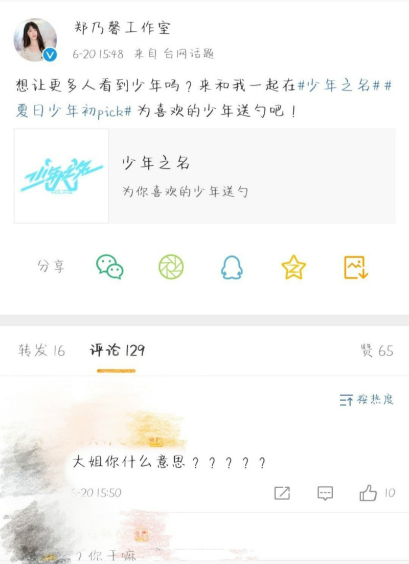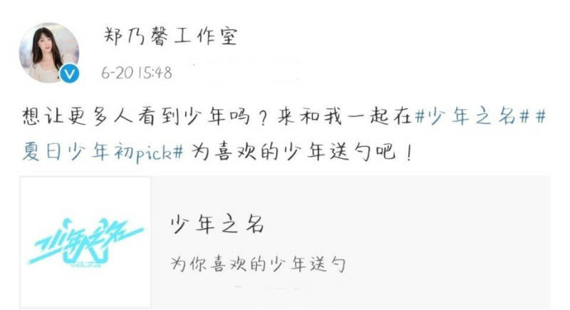 沒想到在下午約4點,《創造營2020》學員鄭乃馨的工作室微博,竟然轉發了《少年之名》呼籲送勺的相關微博,還說「想讓更多人看到少年嗎?來我我一起在 #少年之名# 夏日少年初pick# 為喜歡的少年送勺吧!