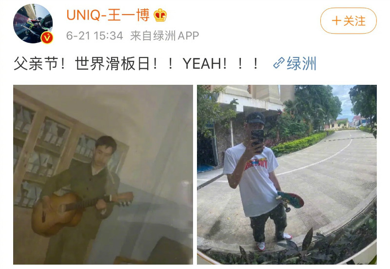 重點來啦!這次除了祝父親節快樂,王一博還強調了621同時也是世界滑板日,於是,地球人都知道超瘋狂滑板的王一博,在這麼特別的日子,“極為罕見”的發了自拍!!!