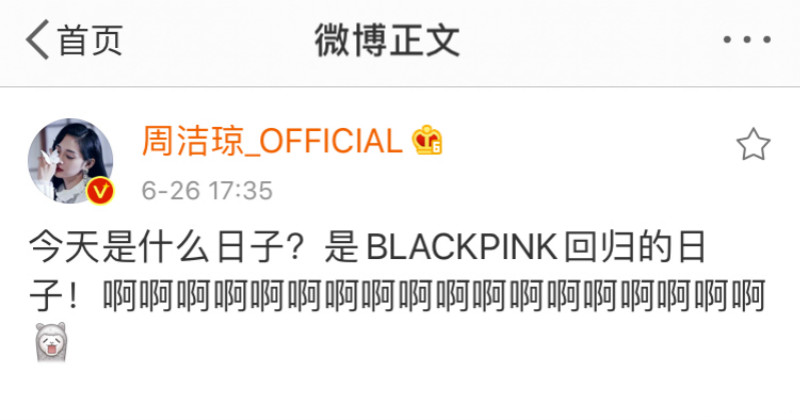 天啊!BLACKPINK的回歸真的是太絕了!各位,BLACKPINK新歌聽起來了嗎?MV看起來了嗎?沒想到原來除了小編如此激動,周潔瓊和李現對於BLACKPINK回歸,也如此激動啊!!周潔瓊就分享了「今天是什麼日子?是BLACKPINK回歸的日子!啊啊啊啊啊啊啊啊啊啊」