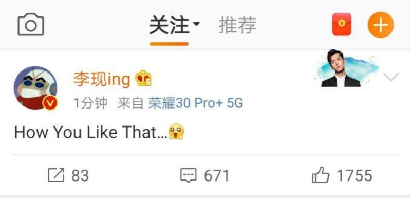 李現更直接在微博發了「How You Like That…」還搭配上一個害羞的小臉。