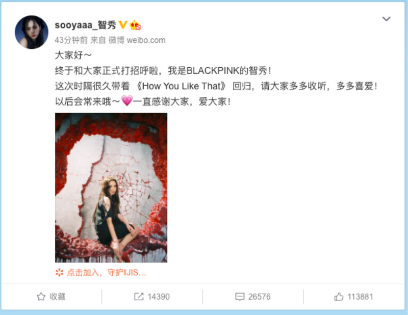 為了這一次的回歸,BLACKPINK的智秀也在微博正式和大家打招呼:「大家好~終於和大家正式打招呼啦,我是BLACKPINK的智秀!這次時隔很久帶著《How You Like That》回歸,請大家都多收聽,多多喜愛!以後會常來哦~一直感謝大家,愛大家!」