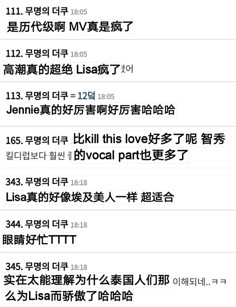 來看看網友們對於BLACKPINK MV的彩虹屁吧!部分留言包括了:「是歷代級啊 MV真是瘋了」、「高超真的超絕 Lisa瘋了」、「Jennie真的好厲害啊好厲害哈哈哈」、「Lisa真的好像埃及美人一樣 超適合」、「眼睛好忙」、「實在太能理解為什麼泰國人們那麼為Lisa而驕傲了哈哈哈」之類的彩虹屁。