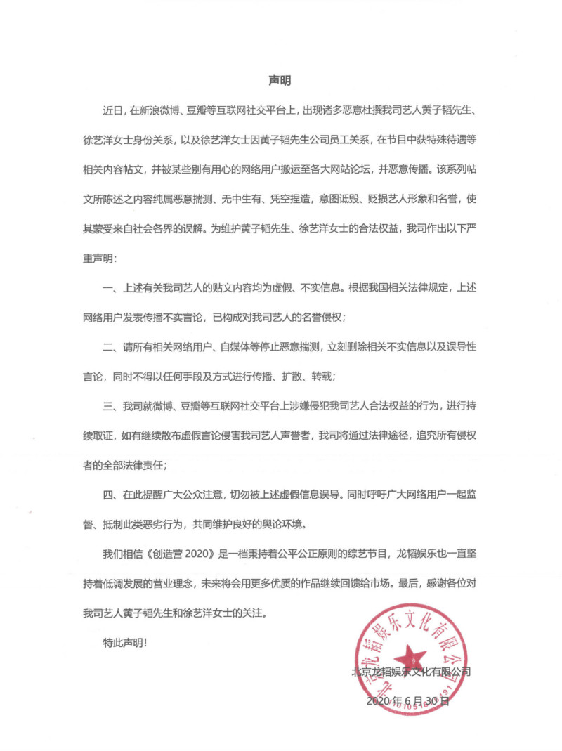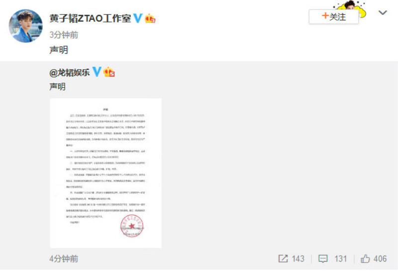 在6月30日下午,黃子韜工作室也針對這件事發表了聲明,表示:將持續取證,如有繼續散步虛假言論侵害藝人聲譽者,將通過法律途徑,追究所有侵權者的全部法律責任。