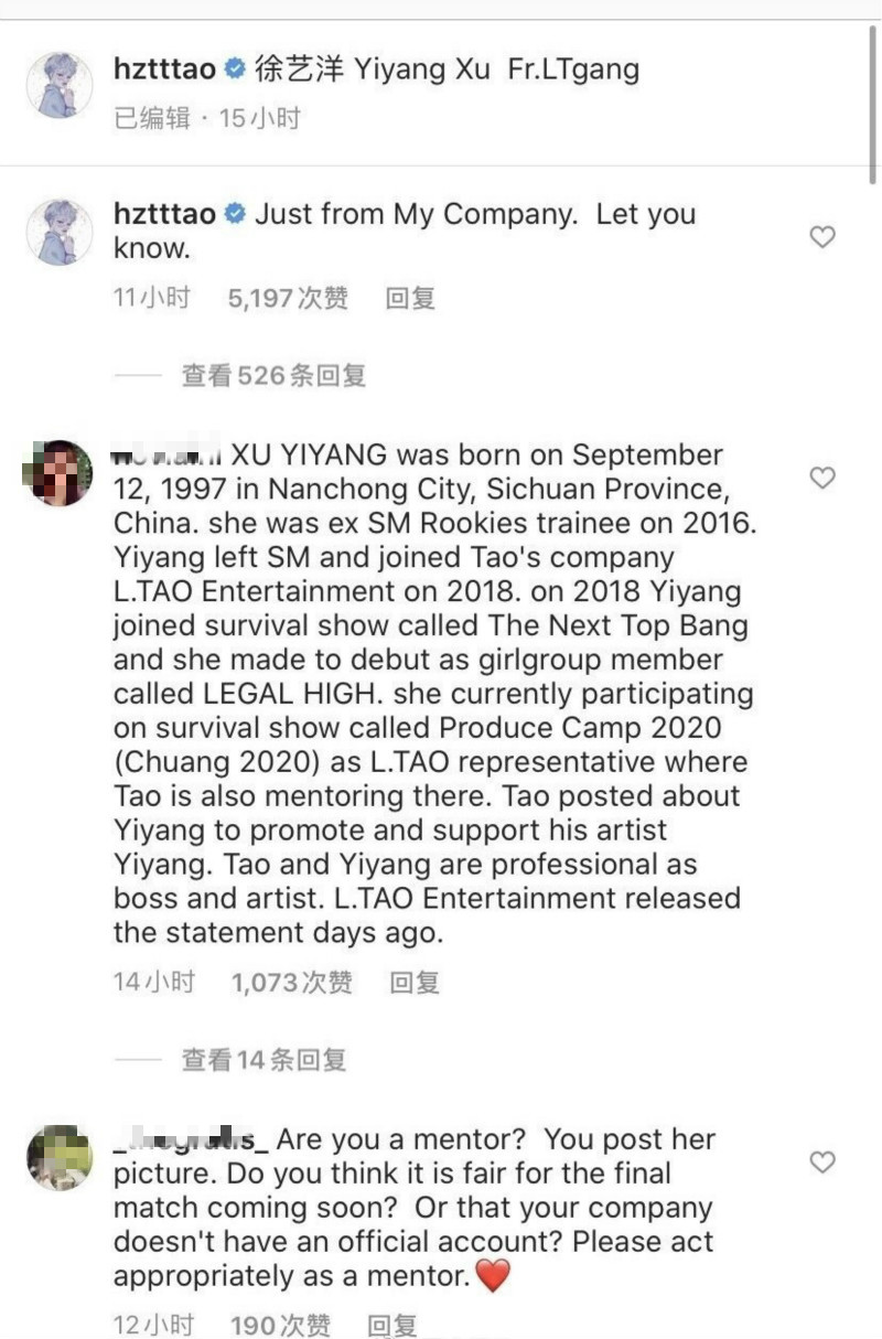 結果,這則IG竟引發了好多網友的留言,其中很多都是外國網友,大家都覺得同時身為《創造營2020》教練和徐藝洋老闆的黃子韜,似乎不應該在即將決賽的這個時候,單獨發了徐藝洋學員的照片。這樣似乎有在「拉票」的嫌疑。