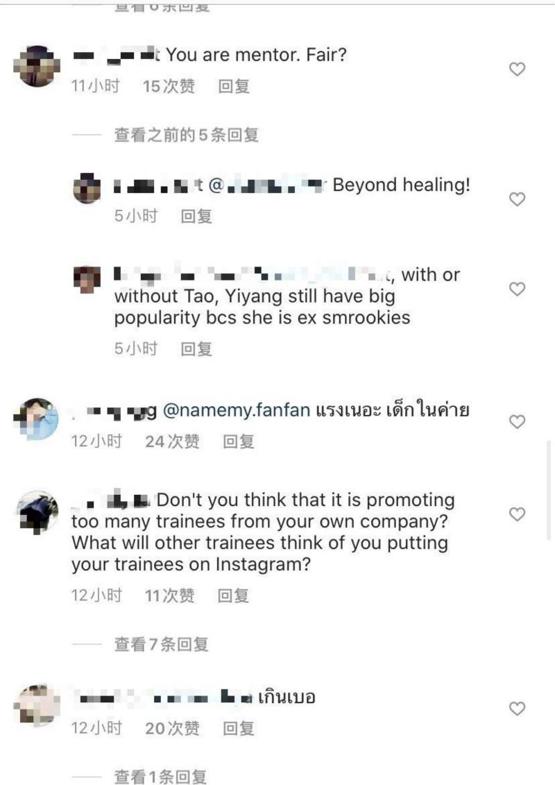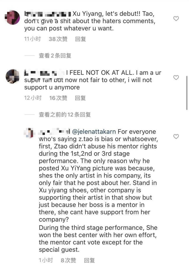 也有網友覺得請不要讓黑子在這個非常時期,抓到可以黑徐藝洋的把柄,但也有人覺得黃子韜在第一次、第二次和第三次的舞台公演時,都沒有濫用教練的職權去特別幫助徐藝洋。從另外一個角度來看的話,這也只是單純的「老闆為旗下藝人打call」而已。
