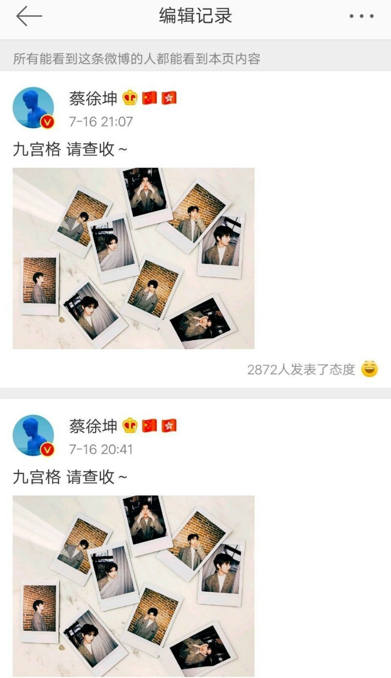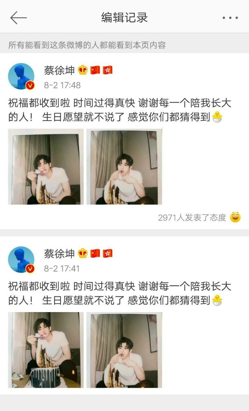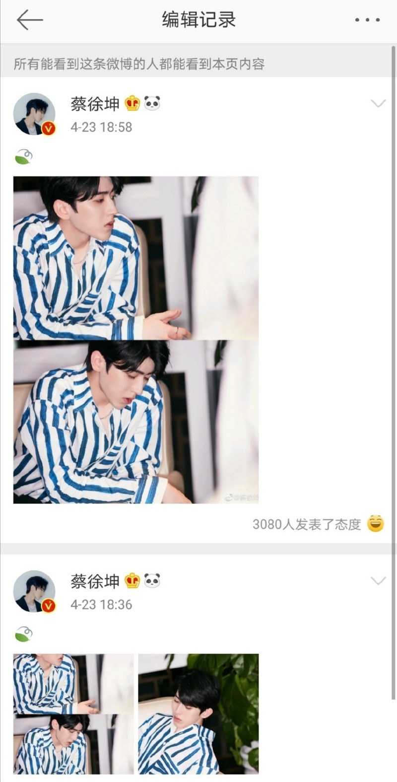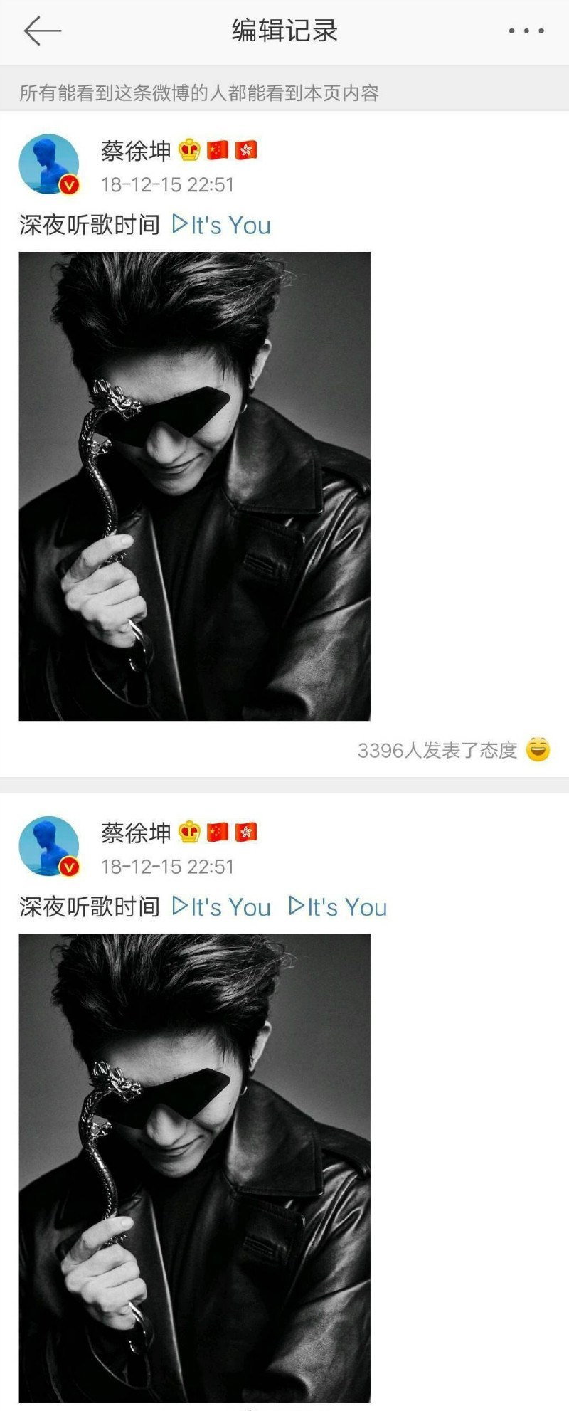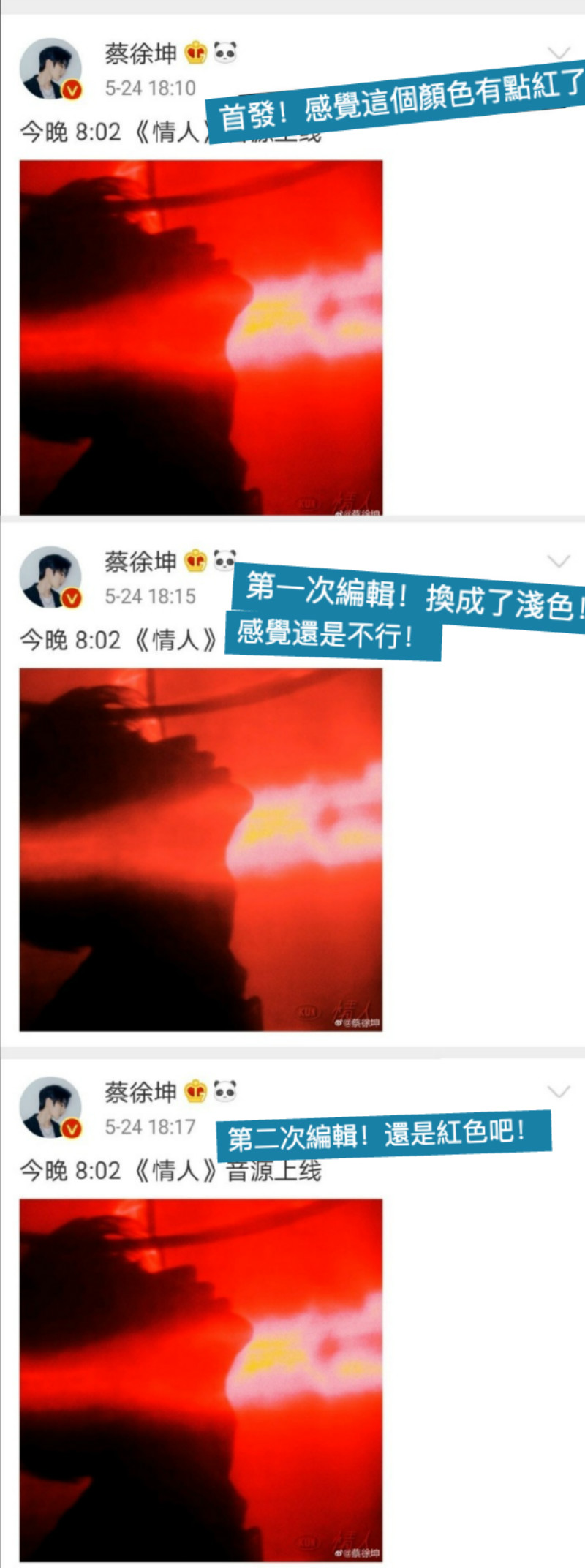 看得出不同嗎?不少ikun都大喊:「寶貝,你又編輯了什麼?」,但也有很多愛坤發現了…沒錯,是照片的濾鏡更換了啊!其實蔡徐坤對自己的微博一向很嚴謹,更有多次編輯微博的先例,雖然很多編輯前後甚至沒太大分別,像之前宣傳《情人》新曲時,就編輯了兩次,但最後還是回到最初的那一個版本,哈哈哈!