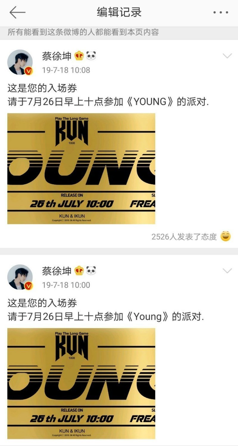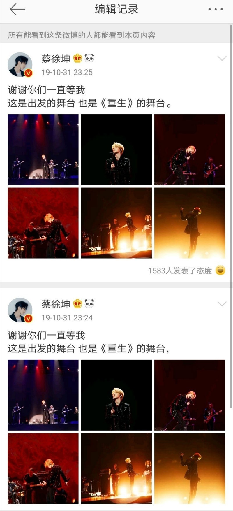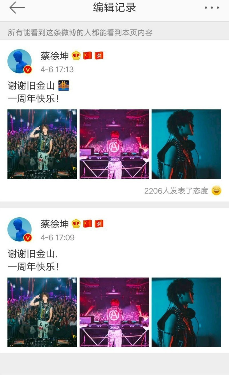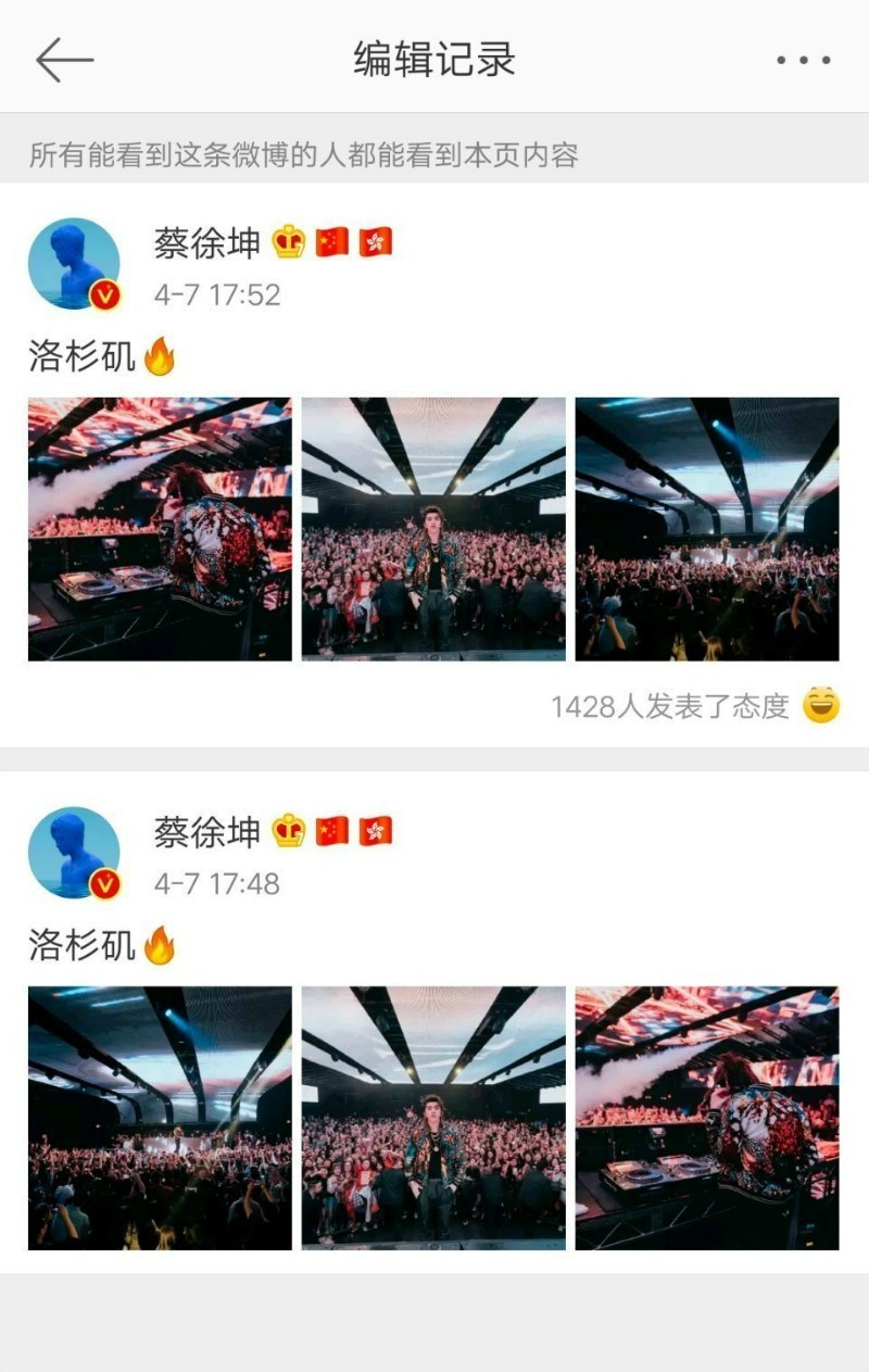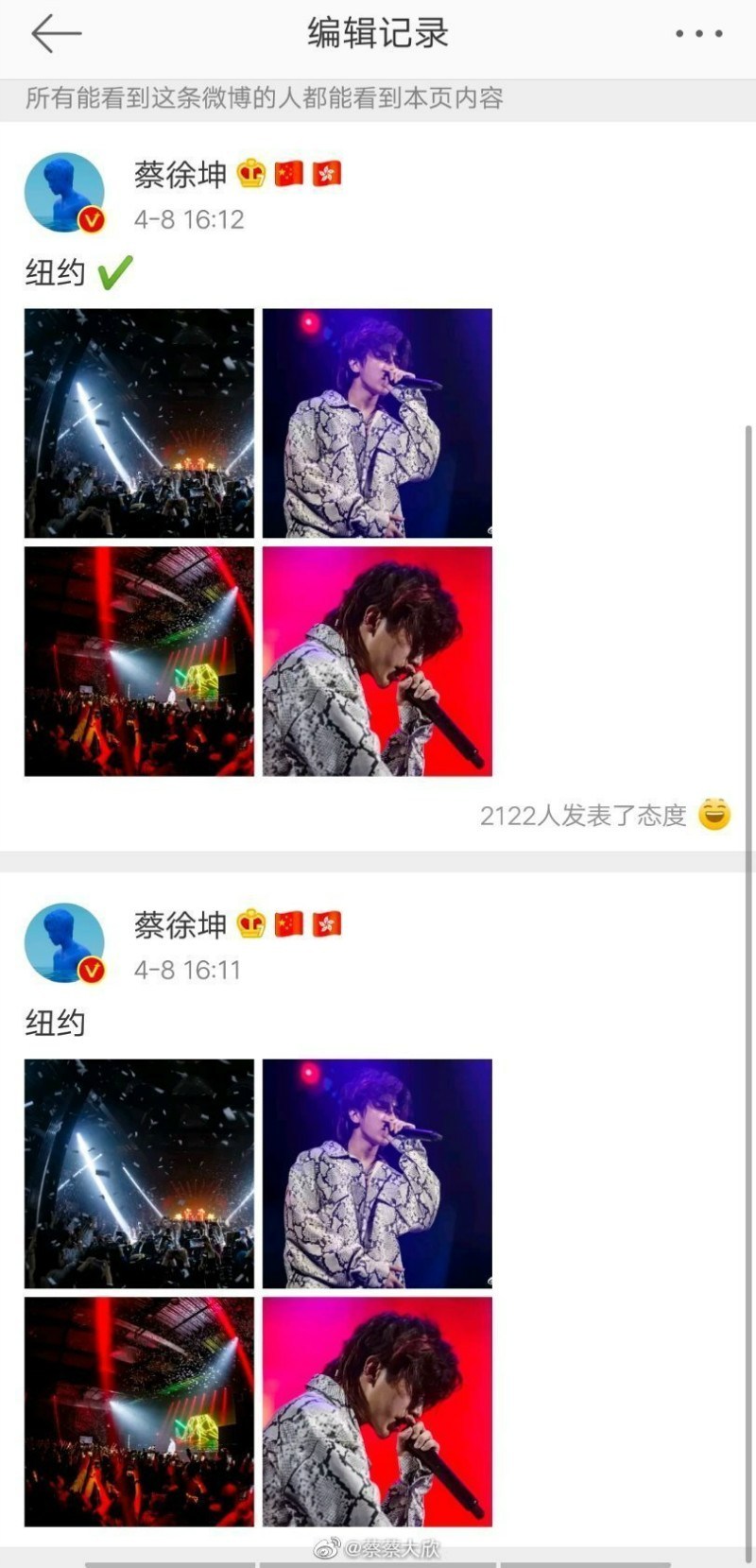 看得出不同嗎?不少ikun都大喊:「寶貝,你又編輯了什麼?」,但也有很多愛坤發現了…沒錯,是照片的濾鏡更換了啊!其實蔡徐坤對自己的微博一向很嚴謹,更有多次編輯微博的先例,雖然很多編輯前後甚至沒太大分別,像之前宣傳《情人》新曲時,就編輯了兩次,但最後還是回到最初的那一個版本,哈哈哈!