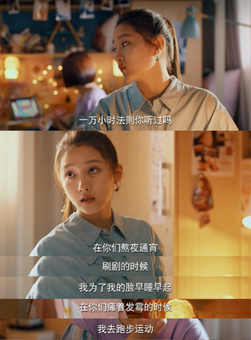 而劇中關曉彤飾演的梁爽,是個個性很直接的網紅,她因為外形亮眼,和室友面試同一家公司時,明明不是本科生卻輕鬆被錄取,面試失敗的室友則分不服氣,覺得靠美貌可恥,對其他人不公平!結果我們的爽姐就搬出了一萬小時法則回懟!梁爽表示:「一萬小時法則你聽過嗎?在你們熬夜通宵刷劇的時候,我為了我的臉早睡早起,在你們攤著發霉的時候,我去跑步運動…」