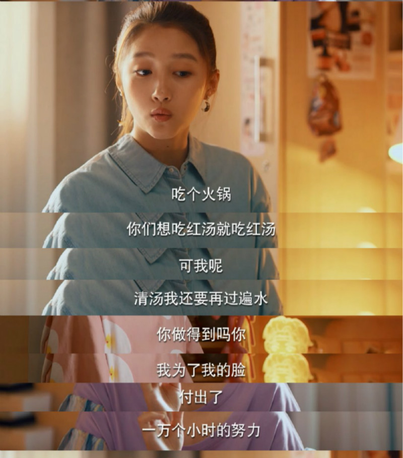 「吃個火鍋,你們想吃紅湯就紅湯,可我呢?清湯我還要再過遍水,你做得到嗎你?我為了我的臉,付出了一萬個小時的努力…」