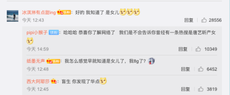 不過評論區的畫風卻很可愛!熱評第一的評論是:「好的,我知道了,是女兒」!結果評論區開始歪樓了!熱評第二的回復是:「哈哈哈,恭喜你了解網絡了,我們是不會告訴你曾經有一條熱搜是唐藝昕產女」而下面的回復基本上分為兩大類,一類是覺得熱評第一的樓主“捉到重點了!”另一派則覺得“唐藝昕產女”不是地球人都知道的事情嗎?這位樓主是不是“周震南式斷網”了?