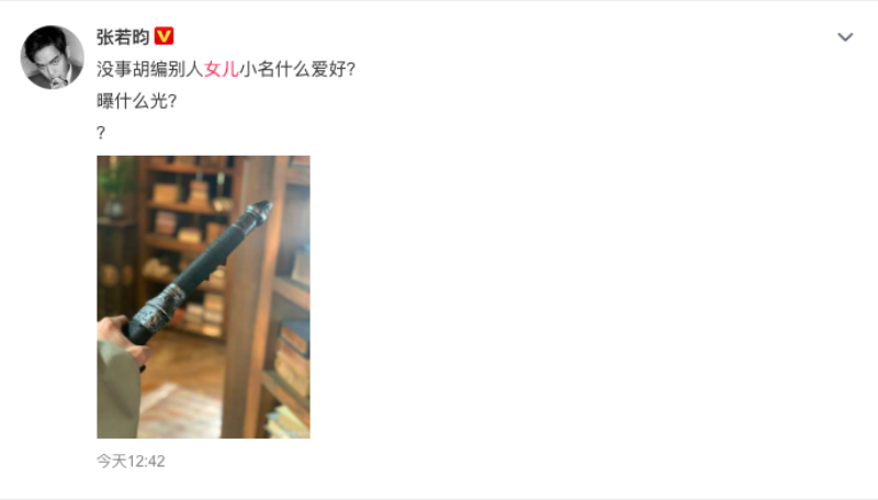 因此張若昀13號發文辟謠網傳的女兒小名,表示:「沒事胡編別人女兒小名什麽愛好?曝什麽光??」並配上了張很「剛」的圖!這圖,可以代表拿劍辟謠,也可以代表很「劍(賤)」!果然是很會懟人的張若昀!