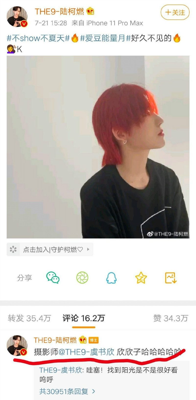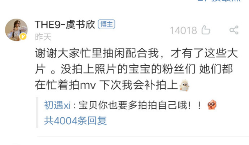 由於作品中少了喻言和陸柯燃,虞書欣也有在評論區解釋表示:「謝謝大家忙裡抽閑配合我,才有了這些大片 。沒拍上照片的寶寶的粉絲們,她們都在忙著拍mv 下次我會補拍上」