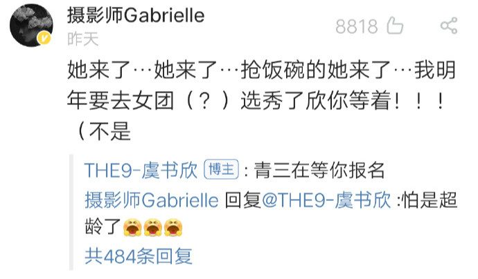 而看見欣欣子拍的作品這麼受歡迎,Gabrielle也搞笑的在欣欣子的貼文留言表示:「她來了…她來了…搶飯碗的她來了…我明年要去女團(?)選秀了欣你等著!!!(不是」沒想到虞書欣居然很有sense的回應:「青三在等你報名」顆顆顆顆!果然是小梗王欣欣子沒錯啦!