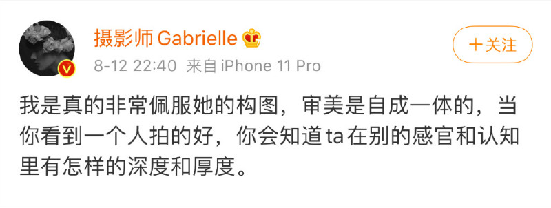 對於欣欣子的作品,這位拍過無數大咖、自己微博粉絲人數有80萬的攝影師Gabrielle表示:「我是真的非常佩服她的構圖,審美是自成一體的,當你看到一個人拍的好,你會知道ta在別的感官和認知裡有怎樣的深度和厚度。 」